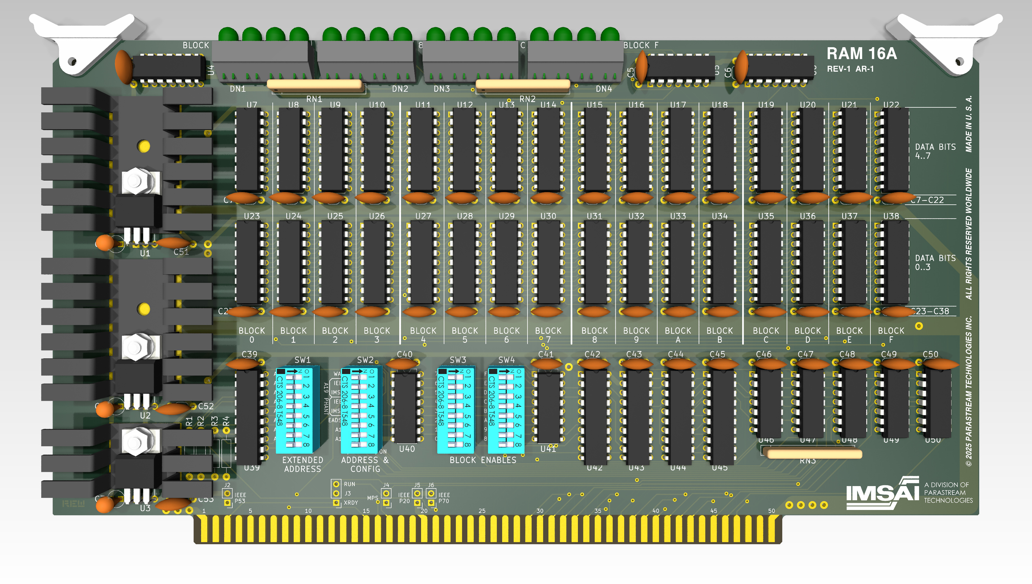 The RAM 16A supports extended addressing and may be configured for IEEE 696 or IMSAI compliant via DIP switches.